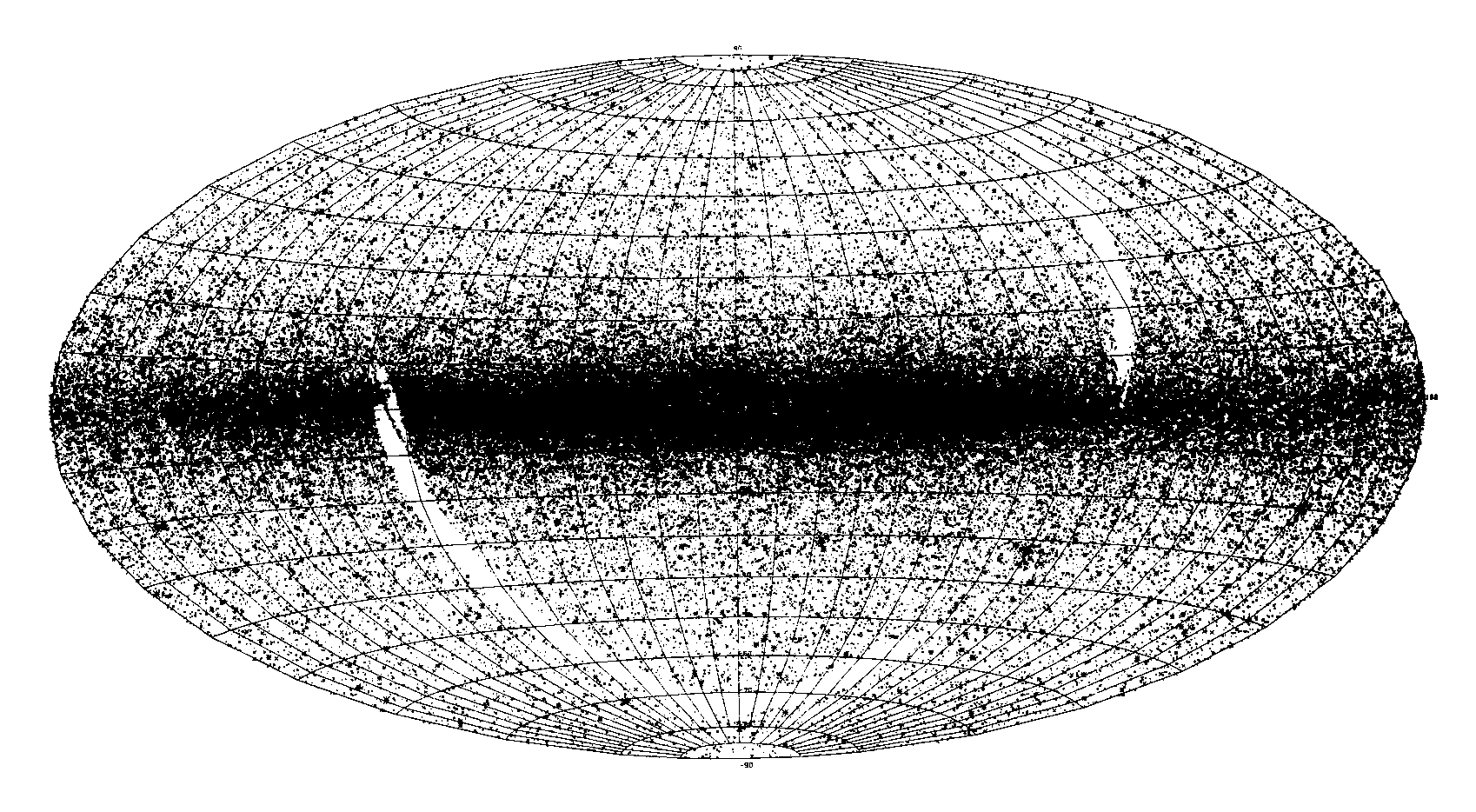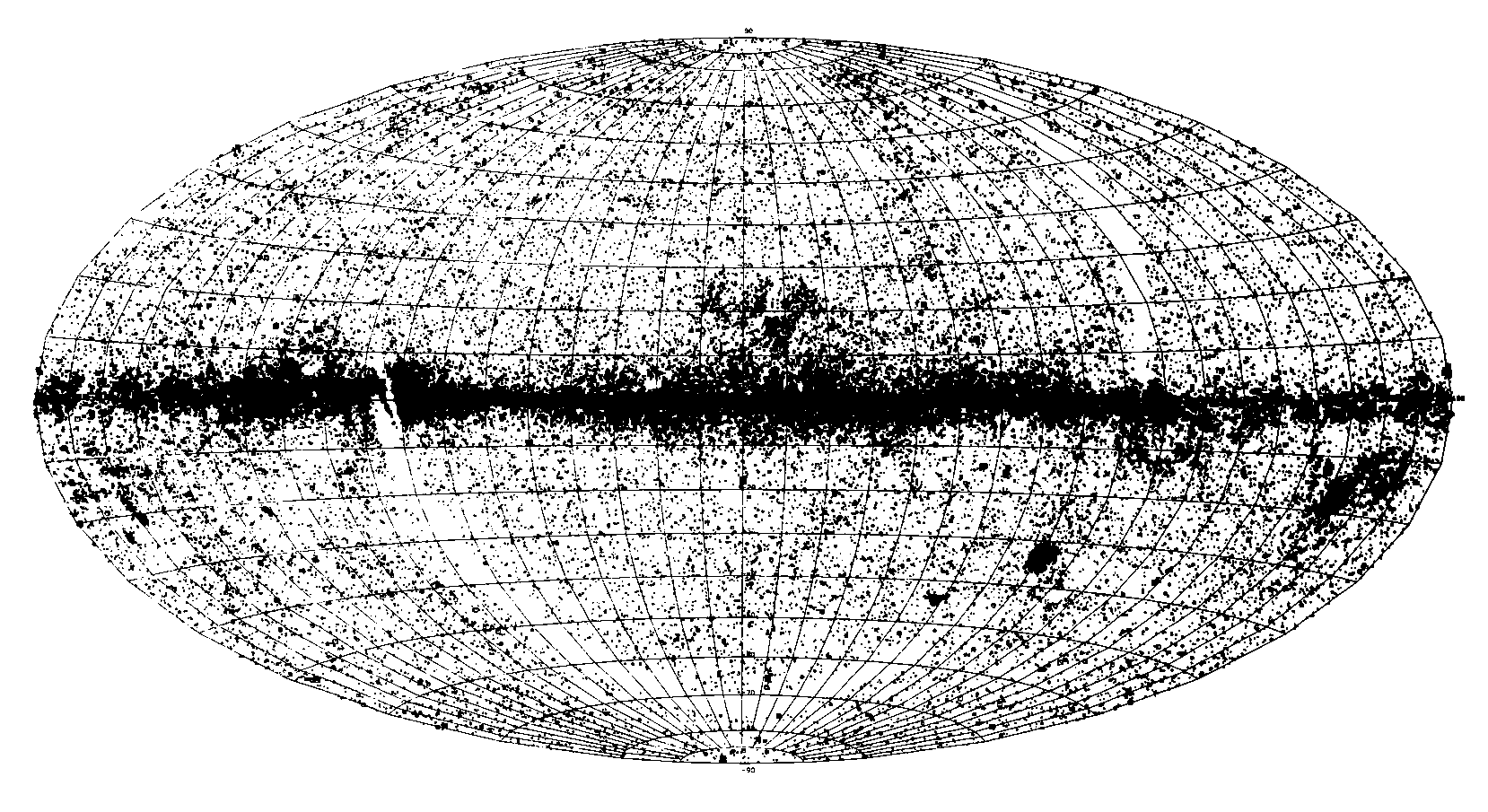 The general distribution of well-confirmed point sources observed by IRAS is shown in Galactic coordinates in Fig. I.C.2 to I.C.4. Three classes of source covering almost all objects in the point source catalog can be defined according to spectral energy distribution: most of 130,000 sources that are brighter at 12 µm than at 25 µm are stars (Figure I.C.2); most of the 50,000 objects that are brighter at 60 µm than at 25 µm and which are located more than 20 degrees from the Galactic plane are external galaxies (Fig. I.C.3); most of the 35,000 sources detected only at 100 µm are cold, dense clumps within the interstellar cirrus (Fig.I.C.4).