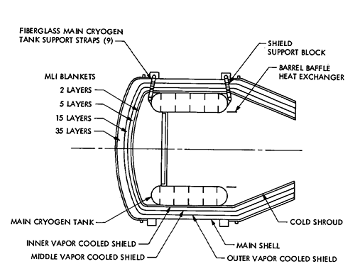 The telescope cryogenic system provided a 1.8 K thermal sink for controlling the temperatures of the optics and detectors. As shown in Fig. II.C.2, the main cryogen tank was toroidal in shape and surrounded the optics and focal plane. Because maximum mission lifetime required isolating the cryogen from external heat loads, the tank was suspended from nine fiberglass straps to isolate it thermally from the exterior main shell. Three shields cooled by venting gaseous helium and 57 layers of multilayer insulation provided additional isolation between the cryogen tank and the main shell. The helium gas left the main cryogen tank through a porous plug made from densely packed sintered stainless steel. The plug allowed vapor to vent while retaining the superfluid liquid. The telescope and focal plane instruments were cooled through the attachment of the optics subsystem to the main cryogen tank near the primary mirror. Heat loads from the aperture were coupled to the venting helium gas by a strap connecting the baffle assembly to a heat exchanger. The gas finally exited to space through two vent nozzles located symmetrically on the dewar exterior.
