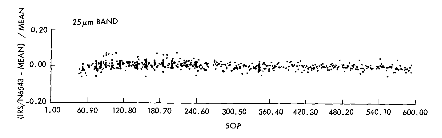 During the course of the entire mission, the stability of the internal reference source as monitored at least daily relative to the planetary nebula NGC6543. The result of this monitoring program at 25 µm for a large fraction of the mission are shown in Fig. IV.D.1. Let Ri,t be, for detector i and time t, the ratio of the amplitudes from the a flash of the internal reference source and from a scan over NGC6543. If <Ri,j> is the mean ratio averaged over the duration of the mission, the quantity