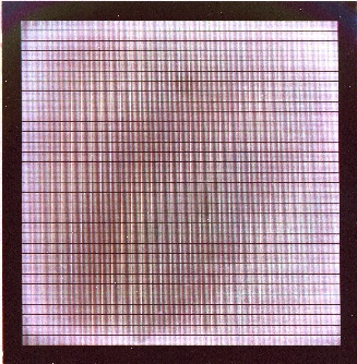32 x 32 array of micromeshes with the same geometry as that of the bolometer above. Each square micromesh is 1.5 mm on a side, and the entire array is 4.8 cm on a side. All 1024 suspended micromeshes are intact although several have defects due to dust contamination. |