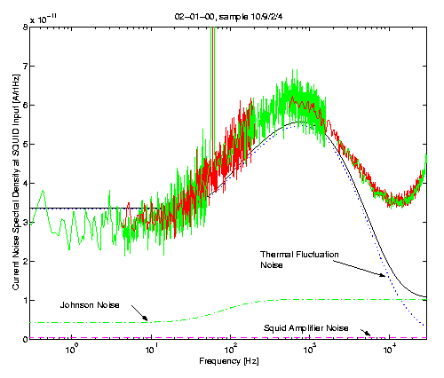 | Suspended VSBs sometimes exhibit high-frequency noise in excess of that expected from simple thermal fluctuations as shown in the figure below. We have developed a model that accurately predicts this excess noise in our devices. In this model, the excess noise arises from a combination of the distributed nature of the bolometer's thermal circuit, i.e. different parts of the bolometer can have different temperatures, and the action of electrothermal feedback. The model shows that this noise can be moved to frequencies higher than the usable optical bandwidth by choosing bolometer materials with reduced heat capacity. A significant reduction in heat capacity compared to our current bolometers should be possible, for example, by using niobium for the electrical leads since the niobium would be far below its critical temperature. The model was tested by fabricating and testing a set of three bolometers with varying heat capacities. It was found that the model predicted the noise of the three bolometers well as shown below for one of the bolometers. A full description of this work can be found in reference [gildemeister00b]. |