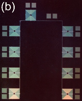 | We have developed a prototype absorber-coupled VSB, shown below, that is suitable for building a nearly filled array on a single substrate. This type of array is placed at the focal plane of a telescope and directly absorbs the incident radiation as with the GSFC pop-up [benford98] or the CEA [agnese99] designs, but our design may be considerably easier to fabricate. The absorber consists of a square micromesh of silicon nitride covered with metal of the appropriate resistivity. There is a TES at the center of the absorber made from a proximity effect sandwich of Al and Ti. The Tc of the sandwich is 304 mK. The silicon nitride supports give strong thermal isolation while occupying very little area. We have measured an NEP of 2.3 x 10^(-17) and a time-constant of 24 ms at a temperature of 304 mK. We have also built a 32 x 32 array of micromeshes, as shown in the second figure below, with the same design as the device in the first figure. All of the micromeshes were intact although several had defects due to dust contamination. Full details are given in reference [gildemeister00a]. |