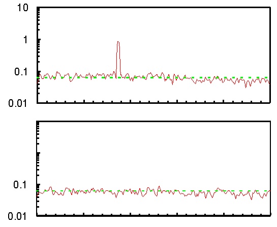 Test multiplexer data using resistors as mock bolometers. Eight channels are multiplexed, and for seven of these the biases are sin-wave amplitude modulated to simulate a signal. The two traces show demodulated data obtained by locking to the same bias frequency as a channel that is amplitude modulated at 8.6 Hz at the top and to the single unmodulated bias frequency at the bottom. Crosstalk is less than 1%. |