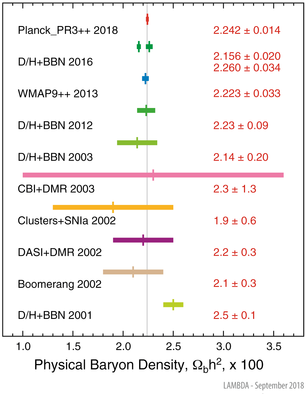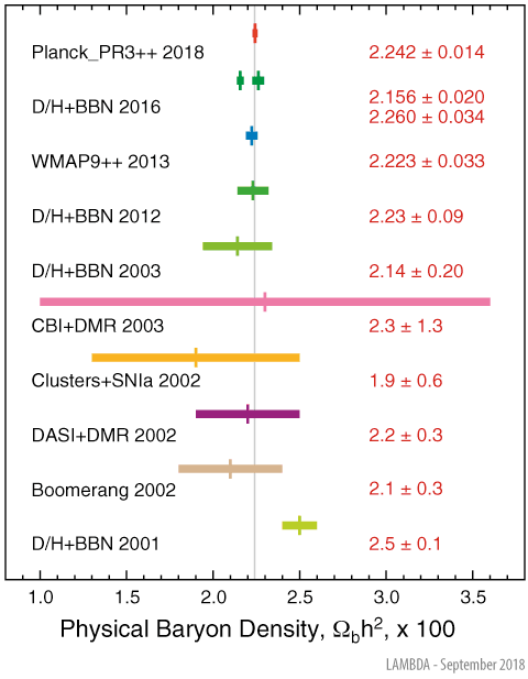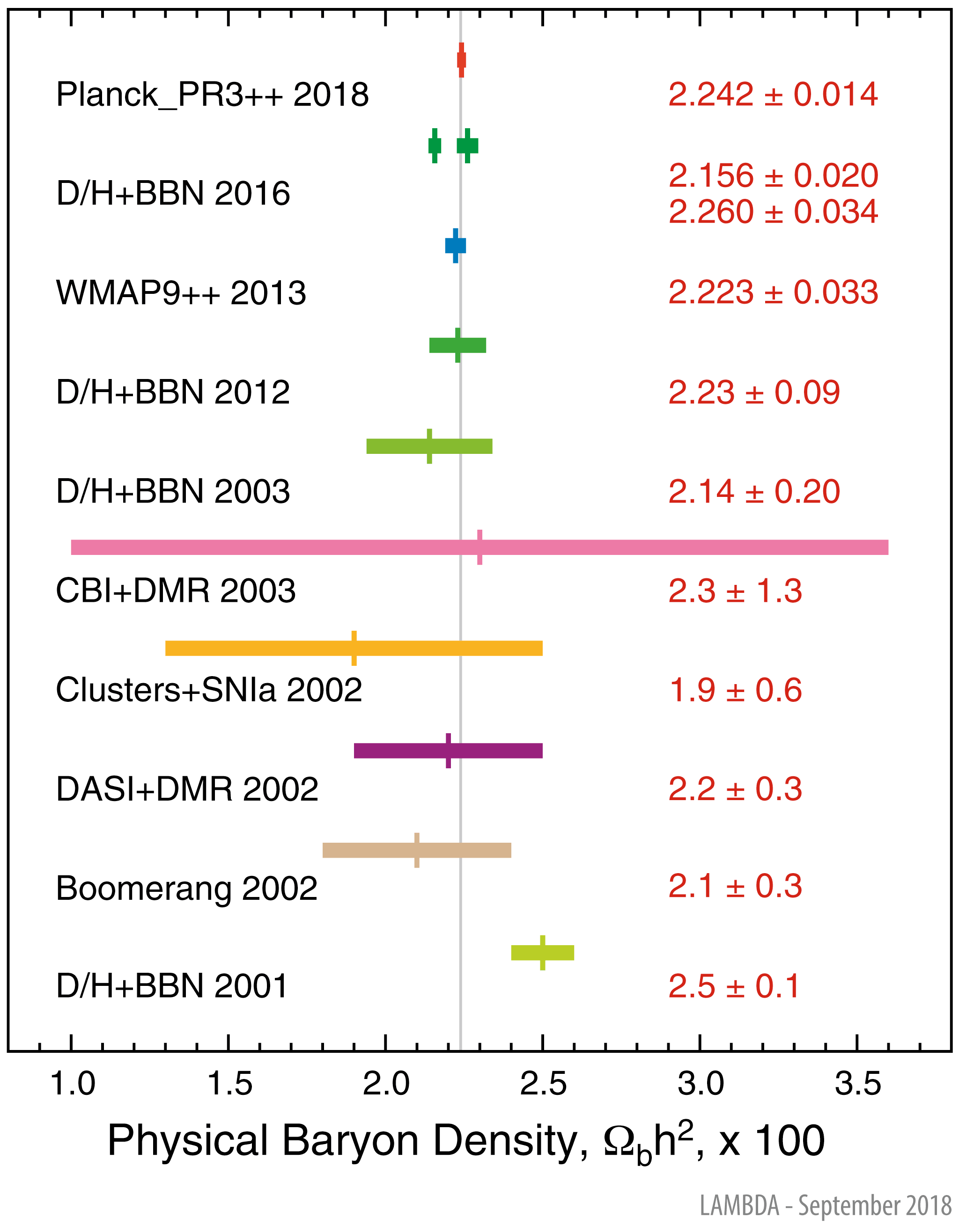 Baryonic DensityValues for the physical baryon density shown in the figure are dominated by determinations based on two separate methods: 1) CMB determinations, in which the derived baryon density depends primarily on the amplitudes of the first and second peaks of the temperature power spectrum (e.g., Page et al. 2003), and 2) primordial deuterium abundance (D/H) measurements coupled with Big Bang Nucleosynthesis (BBN) theory. We quote four separate determinations of baryon density which use D/H+BBN to analyze independent observations of Lyα clouds in QSO or damped Lyα systems (Pettini & Bowen 2001, Kirkman et al. 2003, Pettini & Cooke 2012, Cooke et al. 2016). Error estimates depend both on observational and modeling uncertainties. Kirkman et al. (2003) note that some early determinations may have underestimated the errors; see also e.g. Dvorkin et al. (2016) for further discussion. With continued improvements in data quality and reduction of observational systematics, Cooke et al. (2016) raise the near-term prospect of D/H+BBN determinations of Ωbh2 with uncertainties rivaling those derived using CMB data. However, both Cooke et al. (2016) and Dvorkin et al. (2016) note the increasing importance of accurate nuclear cross section data in the BBN computations. We illustrate this in the figure by quoting two estimates for Ωbh2 from Cooke et al. (2016), which are derived from the same D/H data but use two different estimates of a key nuclear cross section in the BBN computation. We also include a determination using "present day" measurements. Steigman, Zeller & Zentner: (2002) employed SNIa data and the assumption of ΛCDM to obtain Ωm, and then computed the baryon density by combining Ωm with an estimate of the baryon fraction fb derived from X-ray observations of clusters of galaxies (e.g. Ωb = fb Ωm). There is general good agreement between the recent CMB and D/H+BBN determinations shown in the figure. As noted above, reduction of baryon density uncertainties determined via D/H+BBN will require an increased accuracy in modeling inputs. ![]() Image Credit: NASA / LAMBDA Archive Team Most of the visible mass in the universe is composed of baryons (protons and neutrons). Values for the physical baryon density in the universe have generally been determined using either observations of the CMB or deuterium abundance in distant gas clouds with near-primordial composition. Big Bang Nucleosynthesis (BBN) models the production of light elements such as deuterium in the early universe, and given an observed deuterium abundance (D/H), BBN can predict baryon content. We include four such determinations in the plot; these serve as an important independent check on baryonic densities derived from ΛCDM model fits to CMB power spectra. Recent determinations of baryonic content based on CMB and deuterium abundance analyses are in reasonable agreement: see text for discussion of the 2016 D/H+BBN values. Only about 4-5% of the present-day universe is comprised of baryons. The gray vertical line, representing the weighted average of WMAP and Planck data points, is positioned at 100Ωbh2 = 2.239.