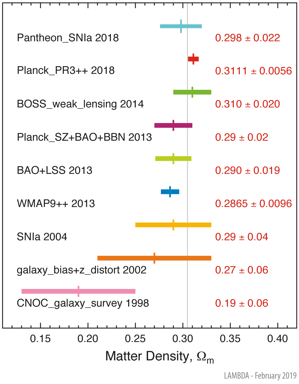 Matter DensityThe Ωm parameter specifies the mean present day fractional energy density of all forms of matter, including baryonic and dark matter. As can be seen in the figure below, a wide variety of techniques have been employed to determine Ωm. The diversity of techniques have not yet converged upon a tightly constrained concordance value, but recent estimates indicate only ∼30% of the total energy density in the universe is contributed by matter (see the gray vertical line in the figure). Galaxy surveys have been used to determine matter density in a variety of ways; we cite several examples. Many early visible light determinations depended on a mass-to-light ratio computed on large scales combined with an estimated luminosity density for the universe (Bahcall et al. 1995). Representative of this method is the CNOC sample, which used X-ray selected clusters of galaxies. Galaxy cluster abundances may be used for a determination of Ωm. However, these are sensitive to a combination of Ωm and σ8, thus requiring some method of breaking the degeneracy. Included in this category is the Planck 2013 analysis of their tSZ-selected sample of clusters, which employed external datasets to break the degeneracy imposed by the cluster constraints alone. This method is also discussed in the σ8 section. Weak lensing may alternatively be used to estimate the dark matter halo masses associated with visible galaxies, but this also carries similar parameter degeneracy difficulties. More et al. (2015) combined BOSS galaxy clustering data with the galaxy-galaxy lensing signal obtained from a spatially overlapping region in the CFHTLLenS catalog, in order to fit dark matter halo occupation model parameters and cosmological parameters. Although Ωm and σ8 are free parameters, priors were placed on other cosmological parameters using WMAP nine-year results. Estimates of the growth rate of structure ƒ from deep large-scale galaxy surveys may also be used to derive Ωm. As described in e.g. Nesseris & Perivolaropoulos (2008), ƒ = β b ≈ Ωm0.6, where b is the bias factor relating the distribution of mass in galaxies to the total matter distribution, and β is the redshift space distortion parameter derived from peculiar velocities. Verde et al. (2002) computed the bispectrum of 2dFGRS galaxies and used it to measure the bias parameter of the galaxies, then combined it with the 2dFGRS measurement of the redshift distortion parameter to yield Ωm at the effective redshift of the survey (z=0.17). A similar concept was used by da-Ângela et al.( 2008) on a QSO sample; their value of Ωm = 0.25 ± 0.08 is consistent with the Verde et al. (2002) result. The baryon acoustic oscillation feature seen in the correlation function of galaxies and Lyα absorbers may be modeled assuming a given cosmology and used to provide some parameter estimates which are independent of CMB determinations. Addison, Hinshaw & Halpern (2013) used combined BAO determinations in the range 0.1 < z < 2.4, coupled with large-scale structure clustering constaints (e.g. Alcock-Paczinski test) to determine values for Ωm and σ8. This analysis deliberately avoids the use of strong CMB priors in order to provide a more independent check on CMB-based results. Galaxy clustering methods may be avoided altogether through SNIa studies. Luminosity distances derived for a sample of SNIa may be used to directly constrain Ωm. under the assumption of ΛCDM cosmology (see e.g. Riess et al. 2004). We display the result of Riess et al. (2004), who used a combined sample of HST and ground-based SNIa observations to obtain Ωm = 0.29+0.05-0.03. Earlier values are in agreement, but with larger uncertainties, such as that from Steigman et al. (2000), (Ωm = 0.28 ± 0.08) utilizing data from SCP (Perlmutter et al. 1999) and HZT (Schmidt et al. 1998). Control of luminosity distance systematics is a recognized issue. Betoule et al. (2014) describe a joint recalibration of SNLS and SDSS SNIa samples with improvements in systematic uncertainties, leading to a derived value Ωm = 0.295 ± 0.034. The current most extensive SNIa compilation is the Pantheon sample (Scolnic et al. 2018), which includes Pan-STARRS1, SNLS, SDSS and HST observations which have been cross-calibrated to Pan-STARRS1. Including systematic uncertainties, Scolnic et al. find Ωm = 0.298 ± 0.022 for standard ΛCDM cosmology, providing the tightest uncertainty obtained from this method in the plot. Abbott et al. (2018) determine a value of 0.331 ± 0.038 from a smaller SNIa sample that includes independent Dark Energy Survey (DES) observations. ![]() Image Credit: NASA / LAMBDA Archive Team Aside from CMB-related determinations, methods to determine total matter density include cosmological interpretation of galaxy cluster abundances, redshift-space distortion measurements, BAO and SNIa luminosity distances. A number of difficulties arise from parameter degeneracies involved in the galaxy clustering techniques. These may be avoided with SNIa analyses, but in this case control of luminosity distance determination systematics is a key factor and affects the quoted uncertainties. Ωm is one of the less well-determined parameters presented here: mild tension exists between the two CMB results quoting the smallest uncertainties (WMAP 2013 and Planck 2018), and constraints from non-CMB determinations are not yet sufficiently tight to highlight any coflicts with CMB results. The gray vertical line, representing the weighted average of WMAP and Planck data points, is positioned at Ωm = 0.3049.